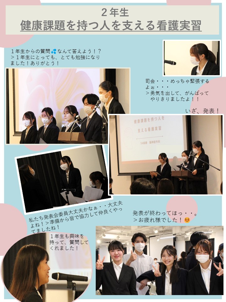 9月に入ってすぐ、2年生は初めての看護過程展開を行う実習を行い、たくさんの学びがありました。看護実習のあと、1・2年生参加でまとめの発表会を行いました。