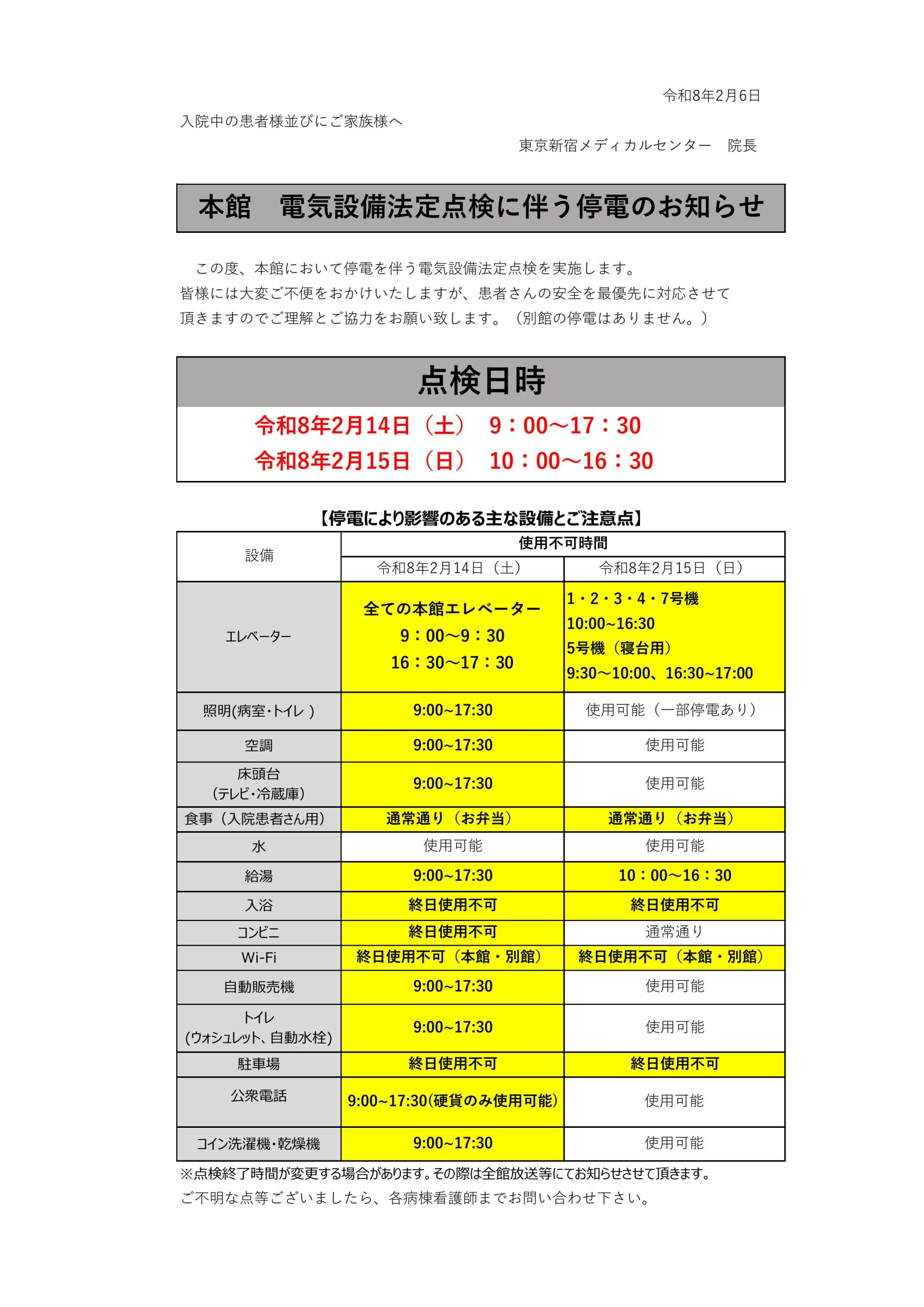 当院につきましては電気設備法定点検を実施する為、下記日程にて本館が停電となります。大変ご迷惑をおかけ致しますが、患者さんの安全を最優先に点検を行って参りますので、ご理解とご協力をお願いします。