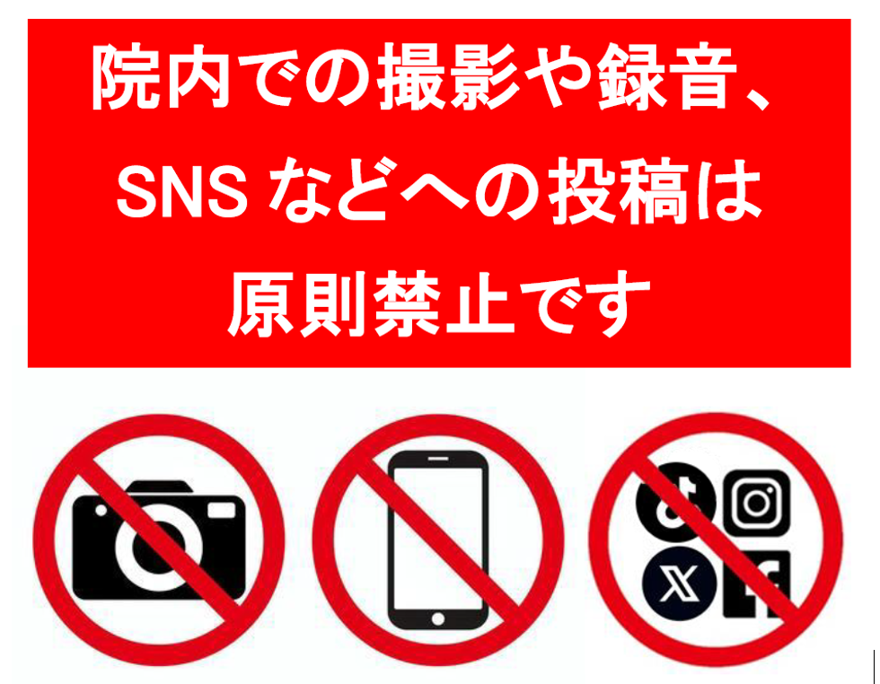 当院では、患者さんや職員のプライバシー及び個人情報を保護するため、院内で許可なく撮影(写真、録画等)および録音等を行うことを禁止しています。許可なく撮影および録音等を行っていることが判明した場合は、データを削除させていただきます。 不審な方を見かけましたら、当院スタッフまでお知らせください。 撮影した写真等をSNS等で公開し問題が発生した場合は、投稿者の責任であり、当院は一切責任を負いません。